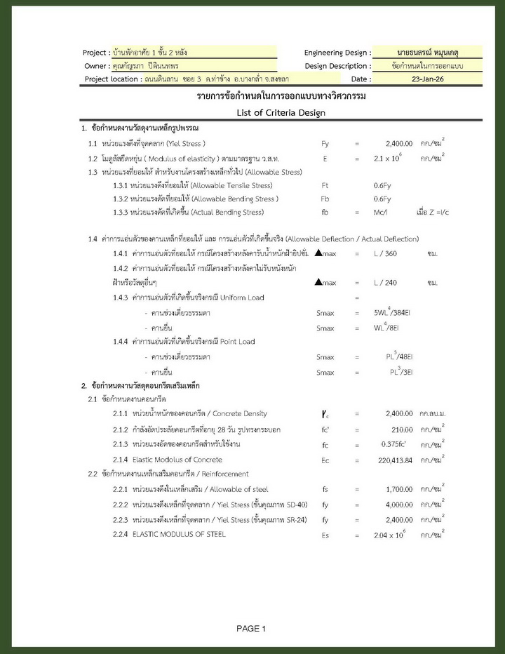 1. ออกแบบอาคาร ค.ส.ล. 1 ชั้น โดยวิธีหน่วยแรงใช้งาน Working Stress Design : WSD อ้างอิงข้อกำหนดการออกแบบตามพระราชบัญญัติควบคุมอาคาร ปี พ.ศ.2566