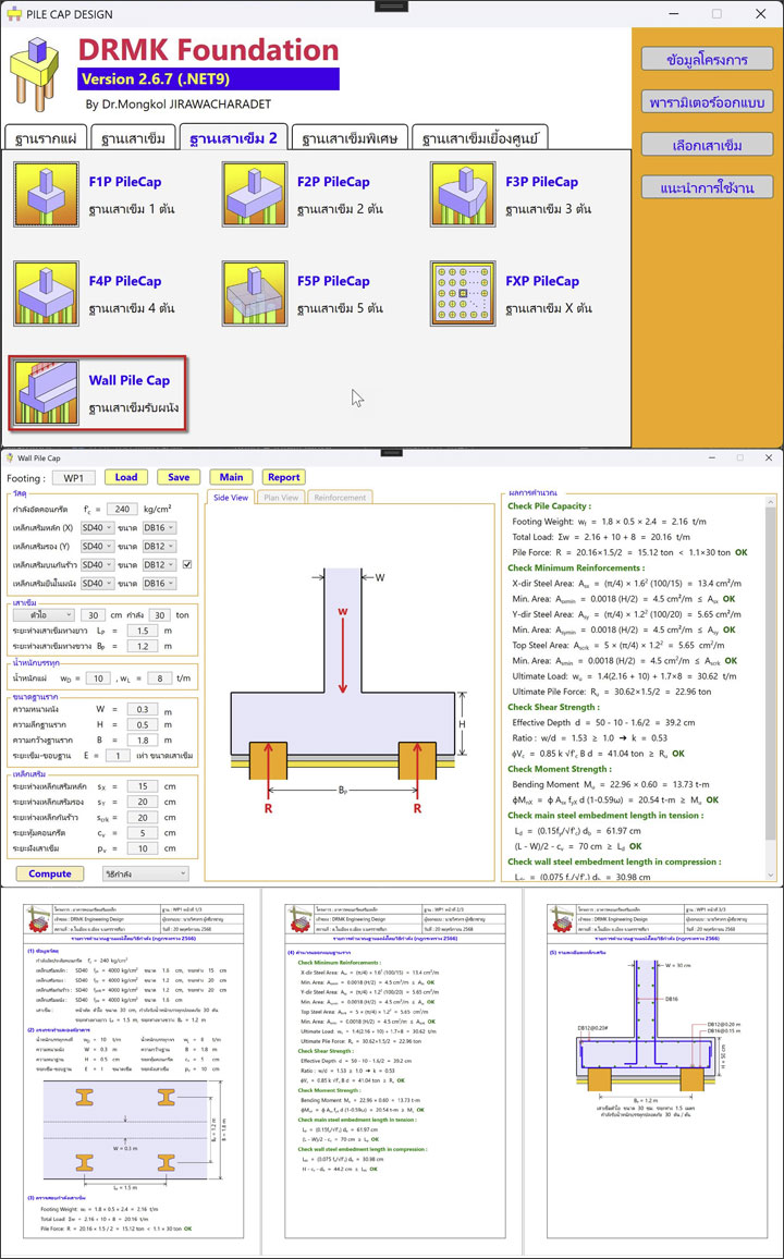 จุดเด่นของโปรแกรมออกแบบฐานรากนี้คือความเรียบง่ายและสะดวกรวดเร็วครับ เราสามารถใส่ขนาดและเหล็กเสริมที่ใช้แล้วดูผลได้อย่างรวดเร็ว ทำให้สามารถปรับค่าต่างๆจนได้ผลการออกแบบที่เหมาะสม ผมมีวิธีออกแบบให้เลือก 5 วิธีเลย ตามที่มีใช้ในประเทศไทยทำให้สามารถดูความแตกต่างของแต่ละวิธีได้อย่างชัดเจน สามารถเก็บผลการออกแบบได้ และสั่งพิมพ์ในรูปแบบรายการคำนวณ แต่สิ่งที่ดีกว่านั้นคือ “ผมเขียนเองทั้งหมดครับ” นั่นหมายความว่าผมสามารถปรับเปลี่ยนแก้ไขเพิ่มเติมได้เองครับ ในเวอร์ชั่นต่อมาจะแบ่งกลุ่มเป็นหลายหน้าครับได้แก่ ฐานรากแผ่, ฐานรากเสาเข็ม(เดิม), ฐานรากพิเศษ และฐานรากเสาเข็มเยื้องศูนย์ เห็นบางคนขอ ออกแบบเสาเข็ม ด้วย ซึ่งก็ทำได้ครับแต่ผมต้องไปเรียนรู้เรื่องดินก่อนครับ เลยว่าจะทำที่ถนัดก่อน ราคาซอฟแวร์จะเพิ่มขึ้นตามความสามารถแต่ท่านที่ซื้อตั้งแต่รุ่นแรกจะใช้ได้ตลอดครับ ถือเป็นการขอบคุณที่สนับสนุนและให้ความเชื่อมั่นในตัวผมครับ (ซื้อก่อนได้เปรียบครับ อัพเดทฟรี)