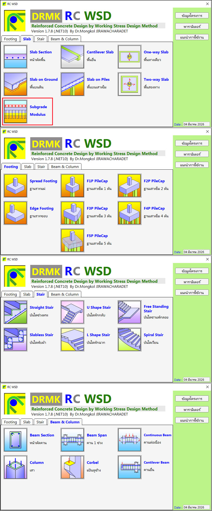 สวัสดีครับ DRMK RC WSD คือโปรแกรมคำนวณออกแบบคอนกรีตเสริมเหล็กโดยวิธีหน่วยแรงใช้งาน (Working Stress Design, WSD) ที่มีความสะดวกรวดเร็วเพื่อช่วยคำนวณออกแบบออกแบบคอนกรีตเสริมเหล็กตามมาตรฐานที่มีใช้อยู่ในประเทศไทยได้แก่ กฎกระทรวงฉบับที่ 6 (พ.ศ. 2527) ออกตามความในพระราชบัญญัติควบคุมอาคาร พ.ศ. 2522, มาตรฐานสำหรับอาคารคอนกรีตเสริมเหล็กโดยวิธีหน่วยแรงใช้งาน ว.ส.ท. 1007-34 (พ.ศ. 2550) และ ว.ส.ท. 011007-19 (พ.ศ. 2562) วิศวกรรมสถานแห่งประเทศไทย ในพระบรมราชูปถัมภ์ เนื่องจากการคำนวณออกแบบคอนกรีตเสริมเหล็กในประเทศไทยนั้นมีลักษณะเฉพาะตัวทำให้การใช้โปรแกรมจากต่างประเทศให้ผลที่ไม่ตรงกับข้อกำหนดและมาตรฐานในประเทศไทยซึ่งมีหลากหลาย ทำให้เกิดความสับสนในหมู่วิศวกรผู้ออกแบบเป็นประจำ ในการพัฒนาโปรแกรมผมจะออกแบบขั้นตอนการคำนวณได้สะดวกรวดเร็วดูเรียบง่าย เมื่อเราสามารถดูผลการคำนวณได้อย่างรวดเร็ว ทำให้สามารถปรับค่าที่ป้อนจนได้ผลการออกแบบที่เหมาะสมอย่างรวดเร็ว นอกจากนั้นยังสามารถเปรียบผลในวิธีต่างๆได้อีกด้วยในตัวผมครับ (อัพเดทฟรี)
