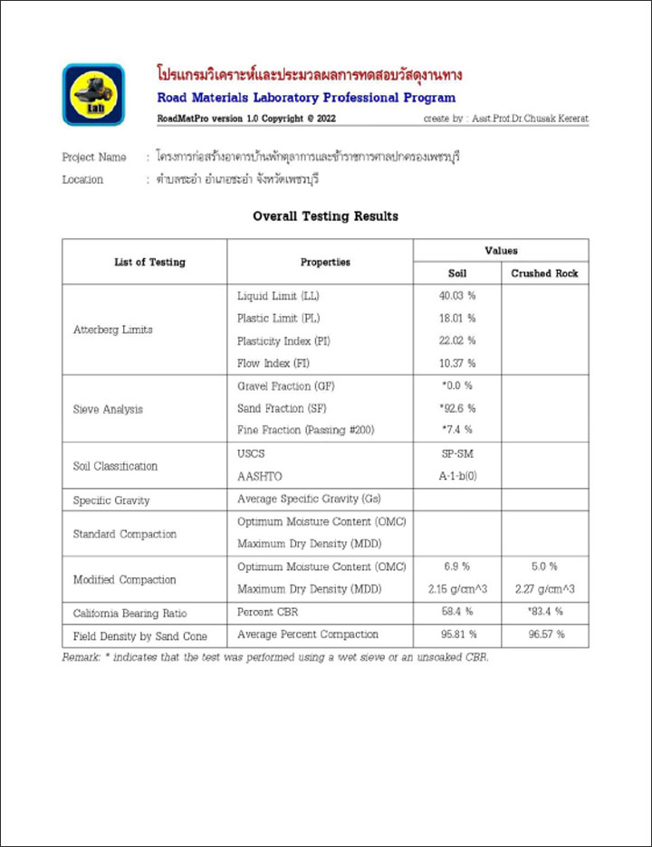 ซึ่งทุกการทดสอบจะถูกจัดเก็บข้อมูลในไฟล์เดียวกัน โดยสามารถตรวจสอบคุณสมบัติของวัสดุที่นำมาใช้งานงานทางได้ในรายงานสรุปภาพรวมของการทดสอบทั้งหมดที่สามารถใช้งานได้ในโปรแกรมนี้ความตั้งใจของผู้ พัฒนาโปรแกรมนี้เพื่อให้สามารถนำใช้งานได้ทั้งในด้านวิชาชีพสำหรับหน่วยงานที่เกี่ยวข้องกับกรทดสอบทางด้านวิศวกรรมปฐพี และในด้านวิชาการสำหรับการเรียนการสอนในสาขาวิศวกรรมโยธา หากมีข้อเสนอแนะใด ๆ จากผู้ใช้งานผู้เขียนขอรับไว้เพื่อนำไปใช้ในการเพิ่มประสิทธิภาพของโปรแกรมในโอกาสถัดไป